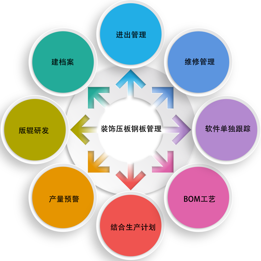 装饰压板钢板管理:压板行业中,钢板作为最重要的物资之一,并且同一种压纹的钢板可能存在多张,必须要通过软件单独跟踪,系统从版辊研发、建档案,进出管理,维修管理,产量预警,并且结合生产计划、BOM工艺等方面统一管理。